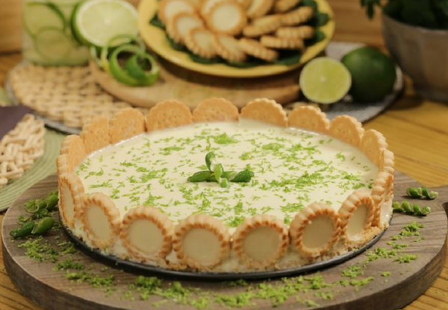 A bolacha Negresco tem um sabor único e é utilizada como base nessa torta de limão. Para o recheio, a deliciosa mistura de leite condensado com limão, gelatina para dar consistência, além de creme de leite para completar.