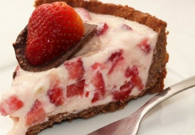 Para essa torta, a base é feita com cacau, pois chocolate combina com morango e com limão. No recheio, mistura-se uma caixa inteira de morangos bem frescos e picadinhos, suco de limão, creme de leite e leite condensado. Fica um recheio rosa, com o toque cítrico das duas frutas.