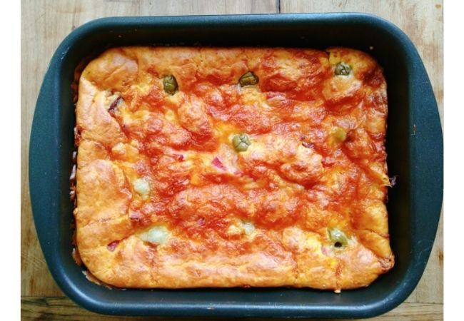 - Coloque o recheio de queijo, presunto, tomate e ovos, e cubra com o restante da massa.