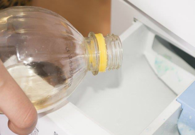 Para isso, coloque vinagre branco até a marca recomendada na gaveta do alvejante e inicie o ciclo. Se quiser, pode despejar diretamente nas peças, no cesto, pois não mancha.