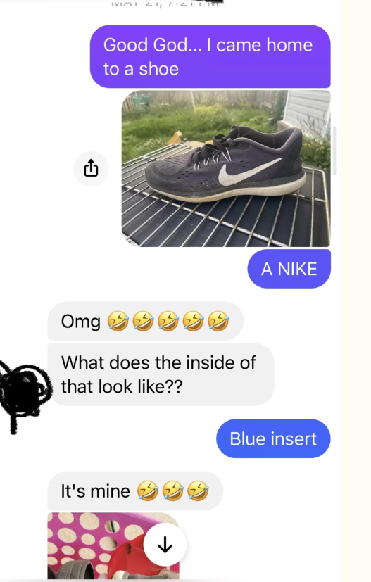 “Não demorou muito para nossa caminhada inicial de vergonha de devolver um Nike que havia uma postagem [na] página do Facebook do nosso bairro de alguém que havia deixado seus sapatos secar durante a noite e acordou com um faltando”, disse Samantha.