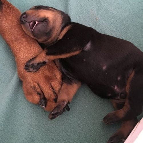 6. Impossível não se comover com esse filhotinho de dobermann dormindo agarrado com a mamãe