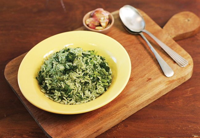 - Meça 2 xícaras (chá) da água batida com as folhas e regue sobre o arroz. Misture o bicarbonato de sódio e o brócolis picado e deixe cozinhar em fogo médio até a água começar atingir o mesmo nível do arroz.