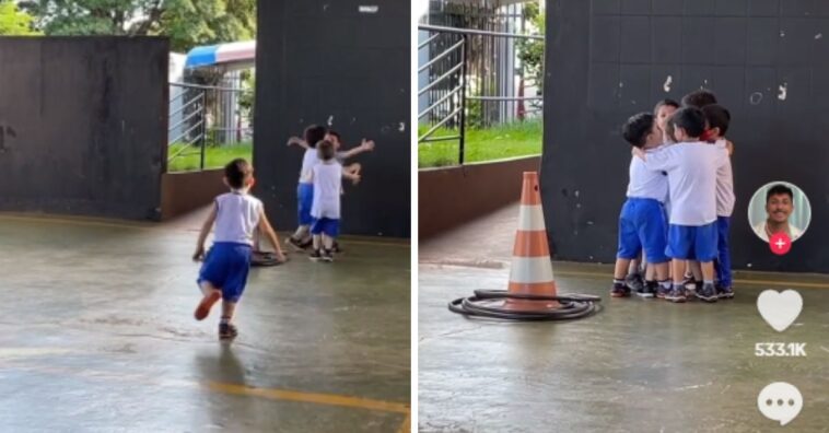 O vídeo que cativou os corações dos espectadores mostrava crianças com idades entre 4 e 5 anos se abraçando calorosamente toda vez que um amiguinho vencia uma corrida de bambolê.