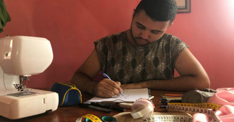 Já no ensino médio, com o apoio dos professores e colegas, ele fez a sua primeira criação autoral, para uma gincana da escola. Ele diz que foi uma grande emoção poder ver uma peça feita totalmente por ele no corpo de outra pessoa. E quer saber a melhor parte? Ela foi eleita como a melhor entre todas as outras, ajudando a sua equipe a marcar ponto.