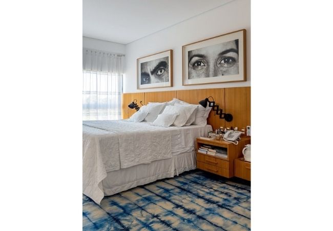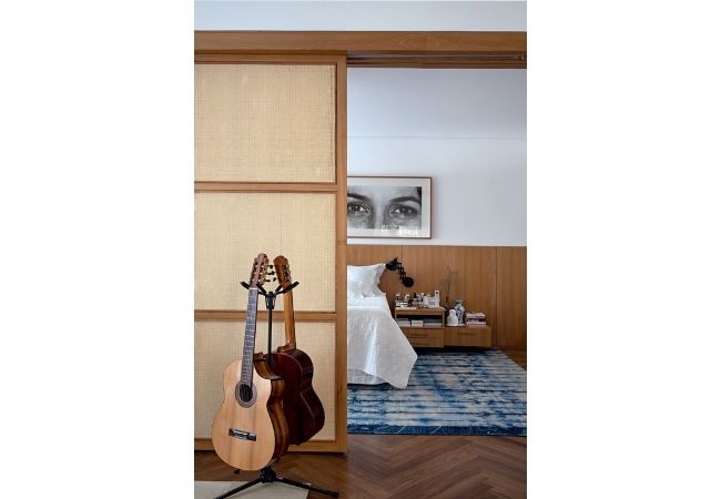 Na suíte do casal a atenção foi especial. Gil queria que tivesse um escritório com divisória de palhinha, onde ele pudesse compor até tarde, sem incomodar o sono de Flora.
