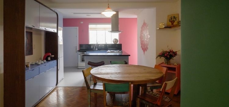A cozinha e a sala de jantar são integradas, mantendo a mesma identidade da sala de TV. Enquanto a sala de jantar traz o aconchego do estilo retrô nos móveis, a cozinha é moderna, com tudo o que é necessário para facilitar a rotina doméstica. A parede rosa ao fundo é a cara da cantora.