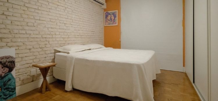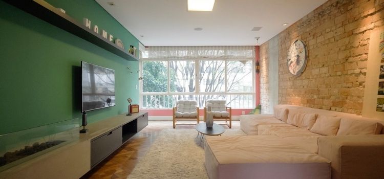 Todo o apartamento tem uma decoração minimalista, mesclando o moderno com o retrô. A atmosfera é de muita leveza e bem-estar. Na sala, um amplo sofá ocupa boa parte do ambiente que tem uma parede verde-escuro e outra de tijolinhos, com um piso amadeirado bem aconchegante.