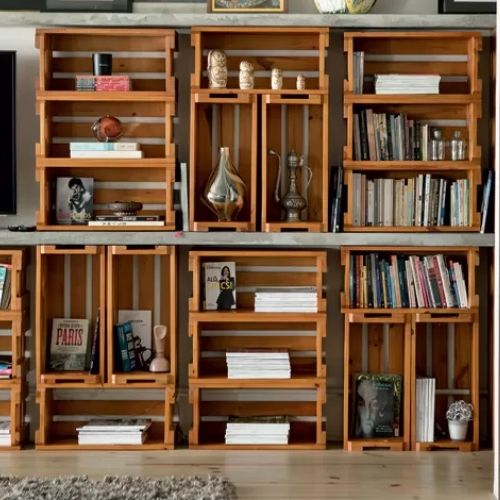 Tem quem goste de colocar uma grande estante decorativa na sala, e fica mesmo muito bonito. Esse modelo é com caixotes bem restaurados, envernizados e numa cor padrão, mas organizados na vertical e na horizontal para dar mais movimento ao observar.