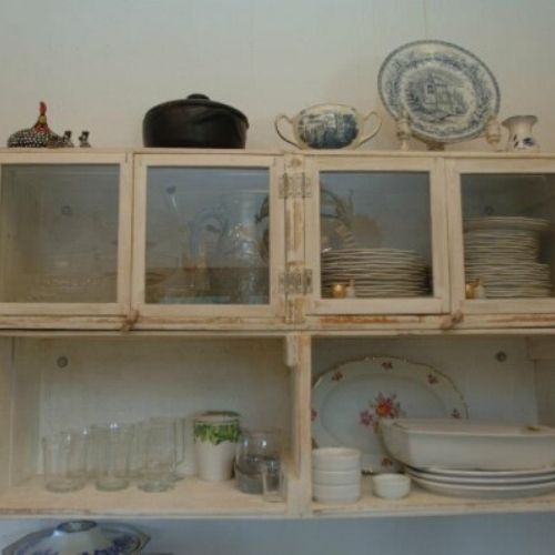 Essa é uma ideia ainda mais refinada. Os caixotes não só viraram um armário aéreo para cozinha, como ganharam portas de vidro para serem uma bonita cristaleira.