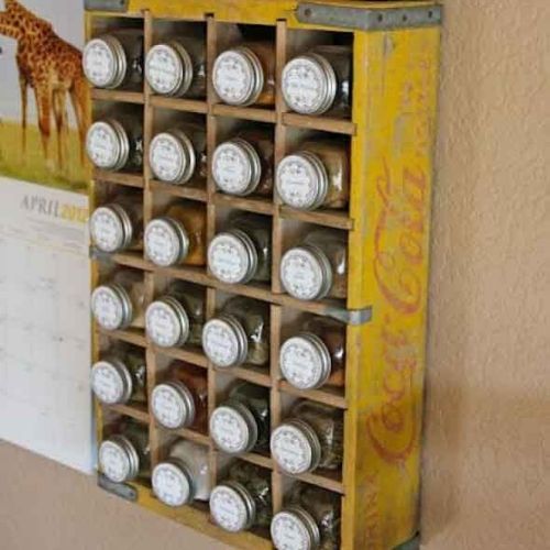 Alguém encontrou uma caixa de feira bem antiga para servir de escaninho aos seus temperos. Nem precisa mexer muito na peça para que não perca o efeito vintage que é o toque especial de design.