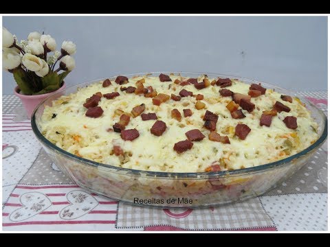 2. Unte um refratário e faça uma camada com metade da quantidade do arroz. Cubra com o refogado e depois a outra metade do arroz.