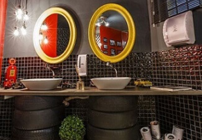 Quer decorar um banheiro temático? Os pneus podem ser usados como estrutura para a bancada e também como moldura para espelhos, nesse caso usando pneus de bicicleta.