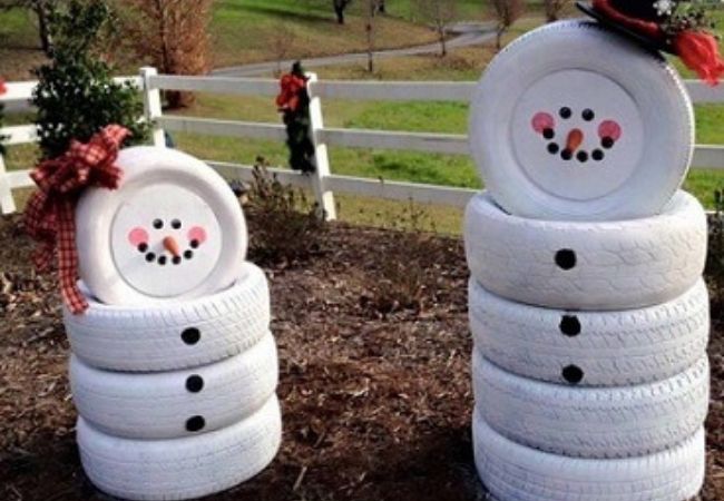 Com o artesanato de pneu você pode criar bonecos para decorar o seu jardim. Esse modelo com bonecos de neve é um exemplo fácil de executar porque também é feito com pneus inteiros, sem necessidade de corte.