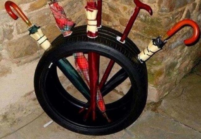 Com um pneu mais largo e inteiro, só precisa fazer aberturas na parte superior ou na peça toda com um anel de metal no acabamento e usar como um suporte para guarda-chuvas. É uma ótima ideia para quem tem comércio.