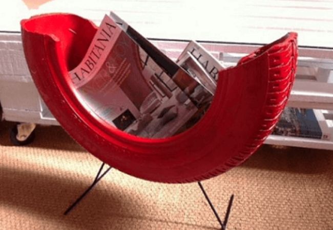 Usando uma ideia bem parecida com a do vaso para horta vertical, se colocar pés de ferro no pneu cortado, ele se transforma em um revisteiro para colocar na sala ou no banheiro.