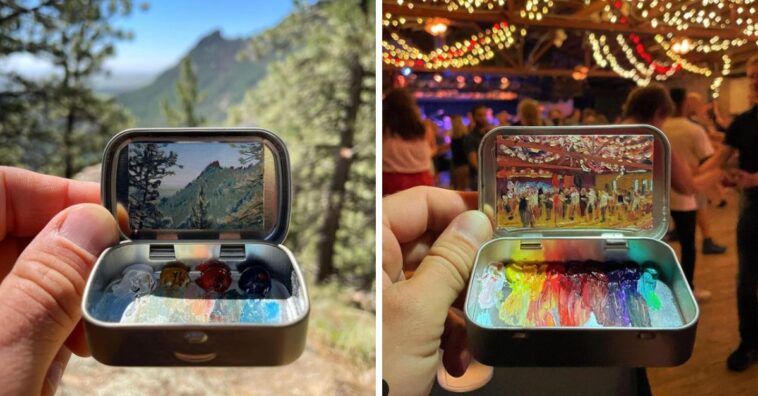 @remingtonrobinsonart An insanely small plein air oil painting in downtown Telluride, Colorado, USA. ⛰ Oil on wood panel in Altoids smalls tin, 1” x 1.875” / 2.54 x 4.76 cm #painting #oilpainting #pleinair #pleinairpainting #miniature #mini #miniaturepainting #minipainting #miniatureart #telluride #colorado #mountains #usa #supersmall ♬ original sound – Remington Robinson