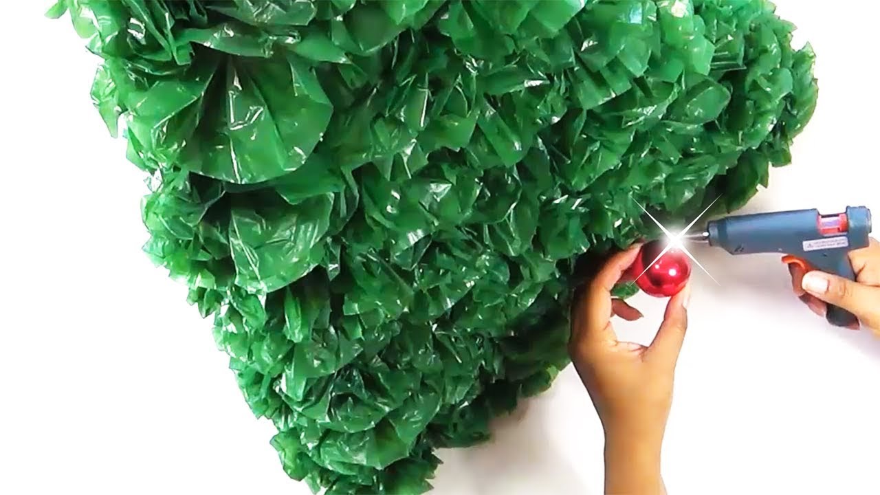 E que tal reaproveitar aqueles sacos de mercado também? Ficaria uma linda árvore de Natal branca, mas você pode usar o saco da cor que quiser.