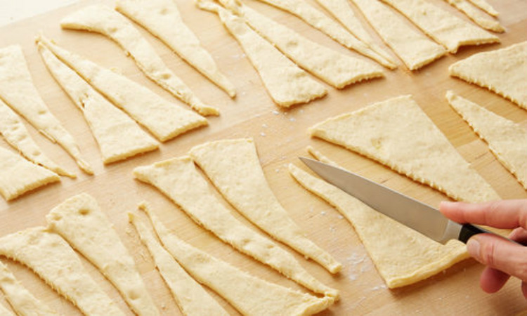2. Em cima de um papel manteiga, abra a massa e corte 16 triângulos;
