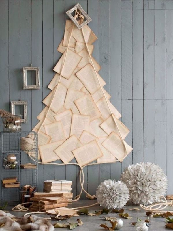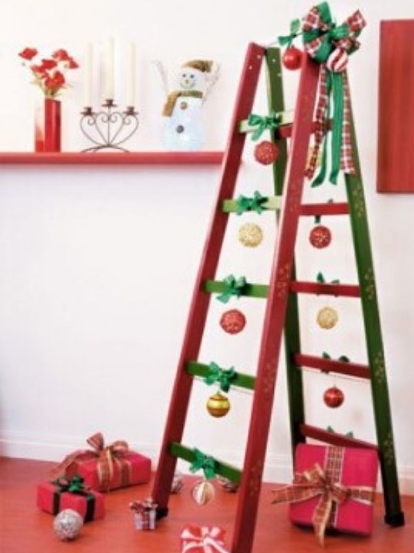 Essa não é bem uma árvore, mas, na verdade, quando está aberta, o formato triangular fica semelhante. Se você tem uma escada de madeira na garagem, que quase não usa, basta decorá-la. Nem precisa pintar, caso ainda vá utilizar outras vezes e prefira deixar na cor original. O interessante mesmo é a ideia e a decoração.
