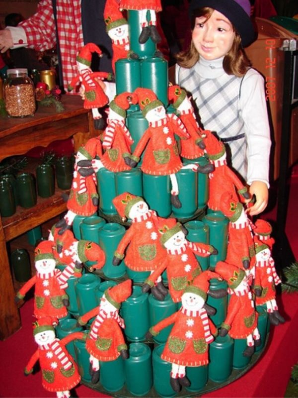 Se na sua casa se consomem produtos como farinha láctea, que vem em latas grandes de alumínio, está aí mais uma boa ideia para fazer uma pequena árvore de mesa. Só precisa pintar as latas, empilhá-las e decorá-las. Uma ideia que as crianças podem ajudar a fazer.
