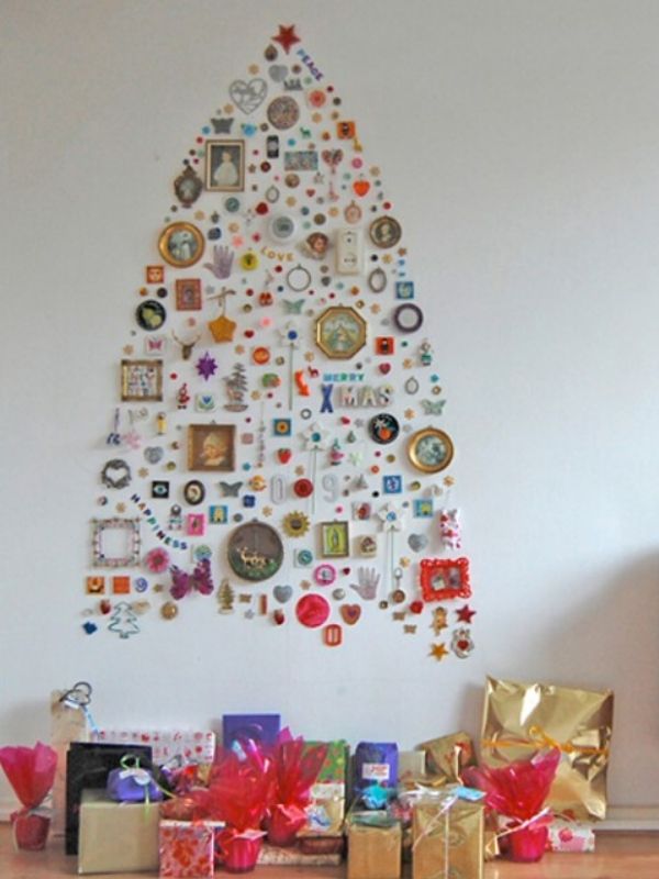 Essa ideia é interessante para você reunir pequenos itens de cada membro da família, como fotografias em tamanho pequeno e pertences que façam lembrar cada pessoa. Só precisa fixá-los na parede, usando fita dupla-face, fazendo o formato da árvore de Natal.