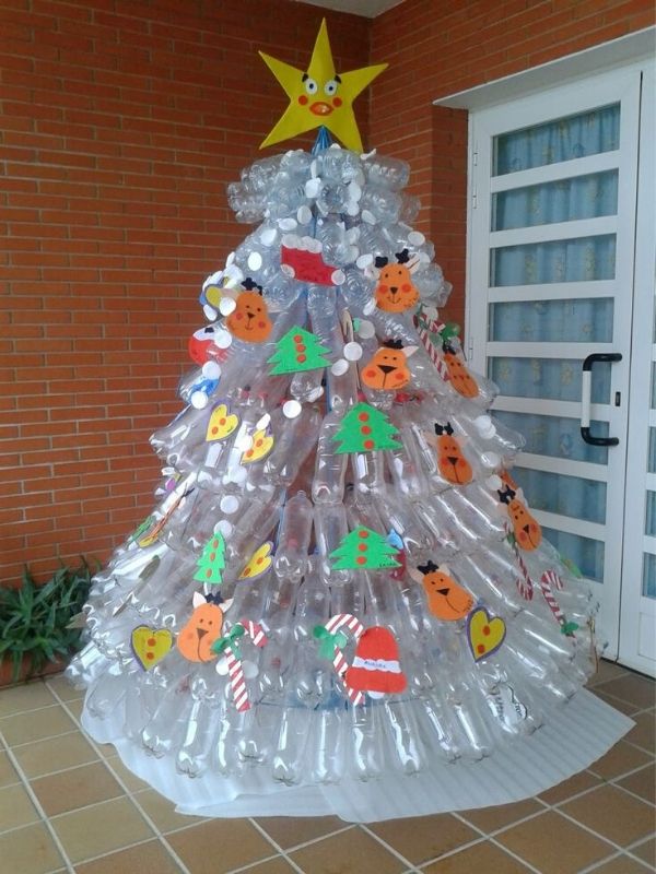 Essa é uma das ideias mais comuns entre as pessoas que gostam de utilizar a reciclagem na decoração natalina. As garrafas são cortadas ao meio para que a parte de baixo seja pintada. Quanto mais garrafas reunir, maior poderá ser a árvore. Como é de plástico, pode até deixar no jardim de casa.