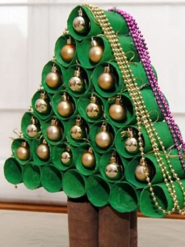 Para essa ideia, nem precisa reciclar materiais que tem em casa, basta que saia à procura de vários gravetos. Ele precisam ser cortados de modo a que formem o triângulo da árvore, depois fixados em um cano de PVC ou um tronco maior que fique no centro.