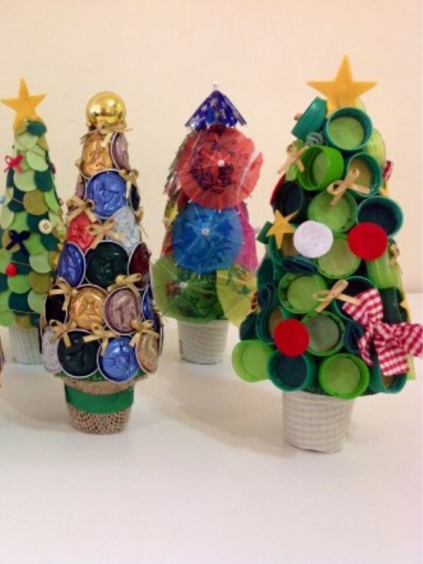Depois de usar as garrafas pet, aproveite também as tampinhas para fazer pequenas árvores de mesa. Use papelão para fazer a base, depois vá colando as tampinhas por todo o cone de papelão. Pode também usar outros materiais, como retalhos e colheres de plástico.