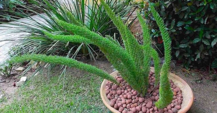 No caso do aspargo pluma, suas folhas se formam em torno das hastes, ficando semelhantes a rabos. Quando ficam longas, se tornam lindas pendentes que podem atingir uns 60 centímetros, mas sem cair muito para baixo.
