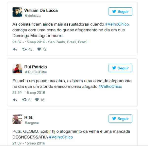 Domingos Montagner não apareceu no episódio da novela “Velho Chico” que foi para o ar dia 15 de Setembro, mas os telespectadores da TV Globo ficaram indignados, porque o episódio começou com o afogamento de uma personagem no Rio São Francisco.