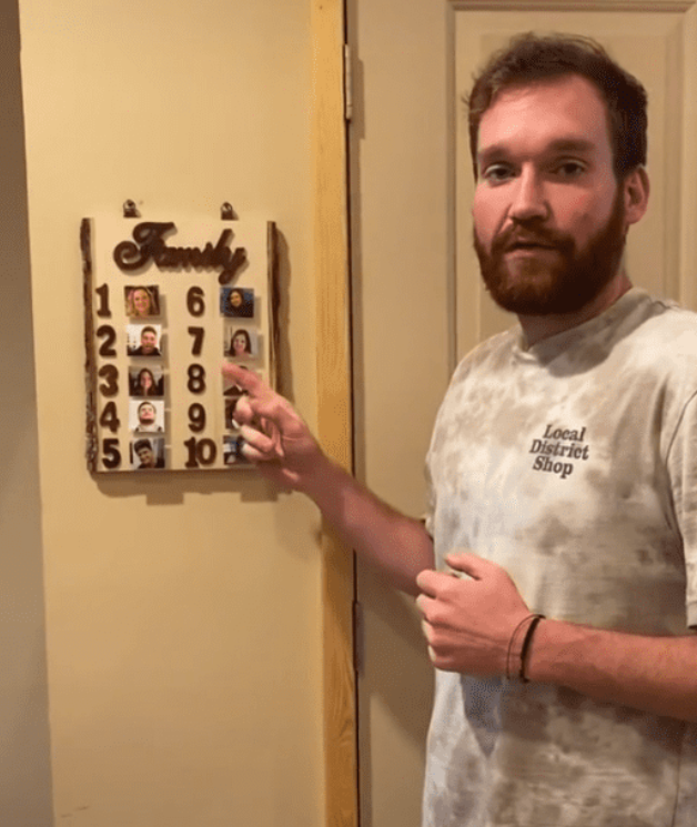 Dan explicou no vídeo: “Este é o quadro de classificação da minha avó. Ela tem uma tábua de madeira onde classifica os 10 netos de 1 a 10, todos os nossos rostos em imãs.”
