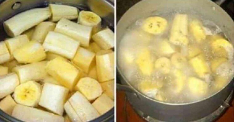 2. Assim que estiver fervendo, junte a banana descascada na água e coloque uma tampa.