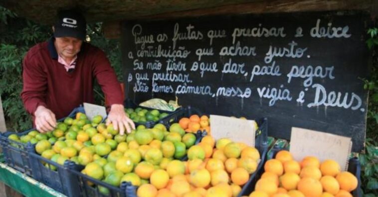 Na parede de fundo da banca, a mensagem é clara e convidativa: “Pegue as frutas que precisar e deixe a contribuição que achar justo. Se não tiver o que dar, pode pegar o que precisar”.
