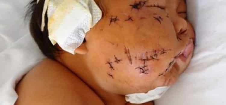 O garotinho Xiao Bao, de apenas 8 meses de vida, sofreu perfurações de tesoura na cabeça e no pescoço, principalmente na região do rosto, feitas pela própria mãe.
