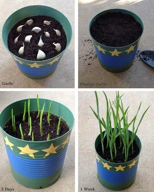 Para isso, coloque os dentes de alho germinados em um copo com um pouco de água até saírem as raízes. Quando estiverem visíveis, basta colocar um pouco de terra em um vasinho e colocar os dentes de alho. Leva cerca de uma semana para ficarem com cerca de 10 cm.