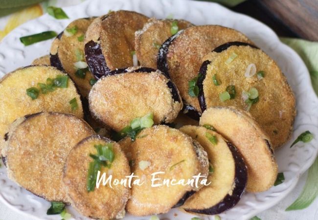 Depois das opções empanadas com trigo e com farinha de rosca, tem também essa ideia para o caso de só ter berinjela e fubá em casa. Muito simples, essa receita leva ovo, leite, sal, pimenta, óleo de gergelim, fubá e óleo para fritar.
