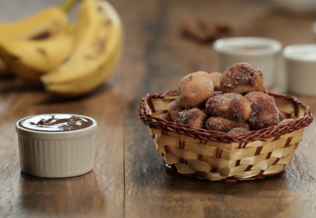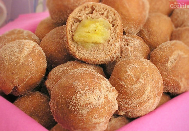 A primeira opção é a tradicional, que leva trigo, ovo, leite, açúcar, manteiga, fermento, além das bananas. Também vai uma pitadinha de sal para agregar sabor. Depois de fritos, os bolinhos são envolvidos em uma mistura de açúcar com canela e, se gostar, pode servir com doce de leite. Veja como fazer, conforme as dicas do canal Receitas e Temperos: