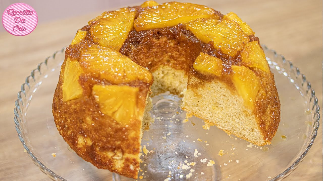 Essa receita, diferente das outras, é feita na batedeira. Além disso, o abacaxi da cobertura é picadinho, fica parecendo uma geleia com uma camada mais grossinha, e a massa é bem fofa.