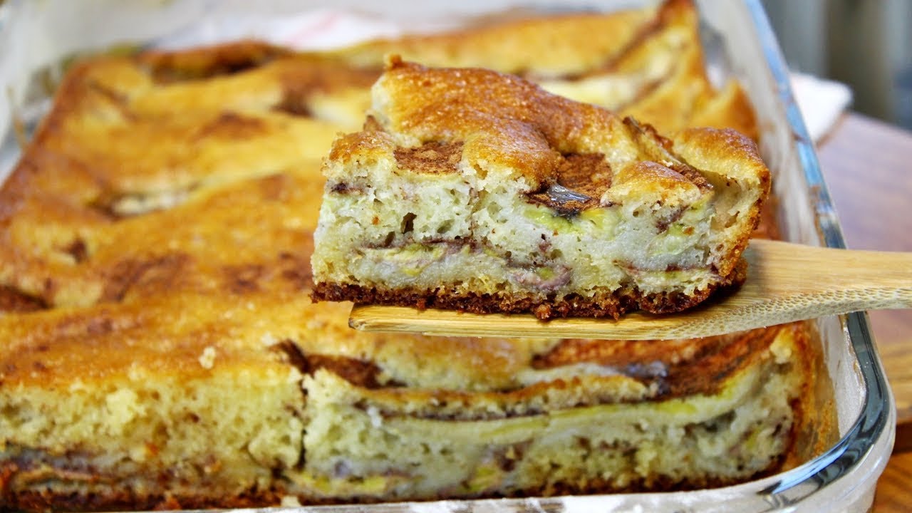 Esse também é um bolo de banana, mas é diferente. Ele fica com camadas de banana fatiada na parte de baixo e a massa na parte de cima. É um bolo simples para fazer no café da tarde.