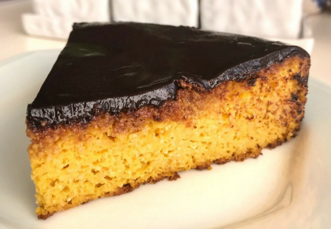 - Para a cobertura, derreta o chocolate 85% cacau e coloque em cima do bolo depois de assado.