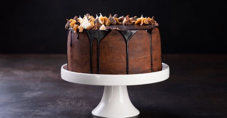 7. Coloque a banda de cima do segundo bolo por cima. Com a espátula, cubra com ganache as laterais e o topo do bolo. Enfeite com folhas comestíveis.