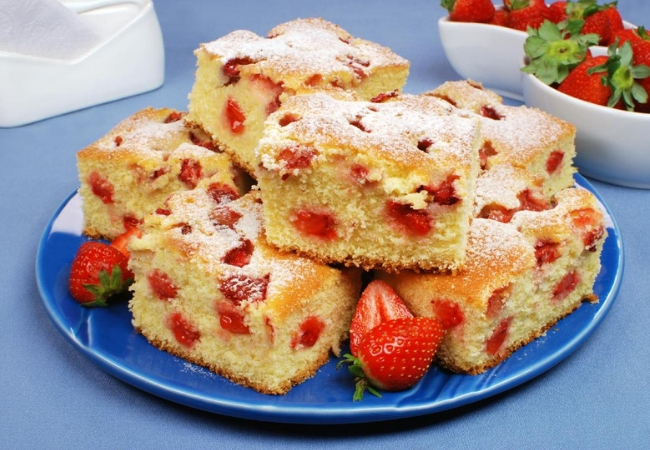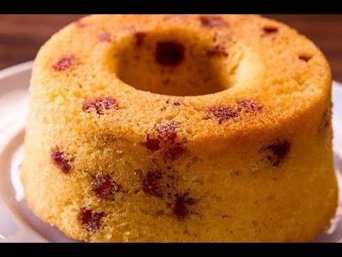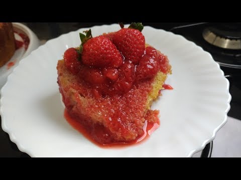 Esse é um bolo de massa simples e tradicional, com trigo, fubá, açúcar, manteiga, maisena, ovos, essência de baunilha e fermento. O segredinho especial de sabor e que deixa o bolo molhadinho é a calda de morangos frescos com açúcar e sumo de limão.