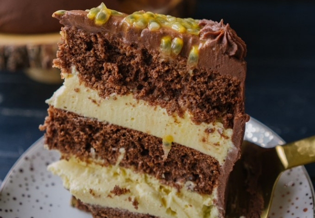 Há quem prefira misturar o sabor da fruta com o chocolate branco e há quem goste mais ao leite ou amargo. Nessa receita a massa do bolo é feita com cacau em pó, o recheio é de leite condensado com suco de maracujá e a cobertura é de ganache meio amargo com polpa de maracujá. Uma mistura irresistível.