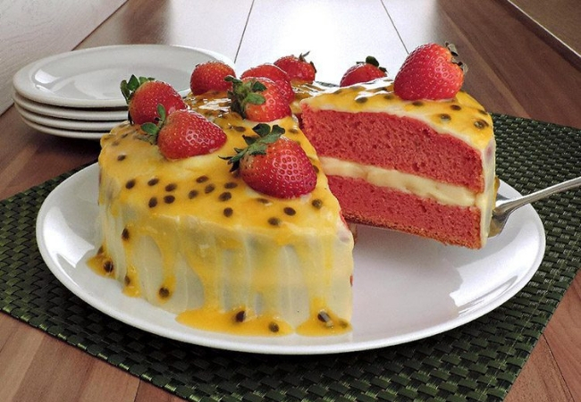 A massa rosa desse bolo é um charme que deixa o doce ainda mais apetitoso. O que dá essa cor à massa é a gelatina sabor morango, que também deixa um sabor especial. O recheio é de mousse de maracujá, que combina cor e sabor com a massa. Para o bolo ficar bem molhadinho é feita uma calda com polpa da fruta, açúcar e água.