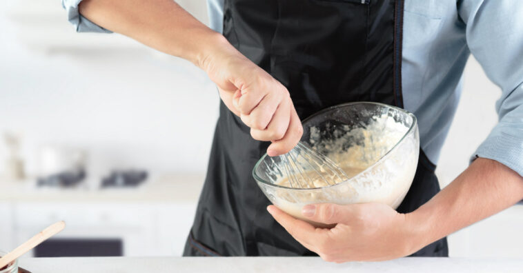 - Aos poucos, adicione o leite quente e misture com auxílio de um batedor de arame. Quando a massa começar a ficar cremosa, cubra com um pano úmido e deixe descansar por 20 minutos para a tapioca crescer.