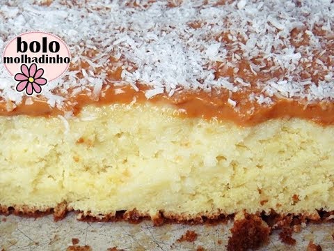 Essa versão leva coco ralado na massa, que fica alta, fofa e molhadinha. Por cima, claro, uma calda feita com leite de coco.