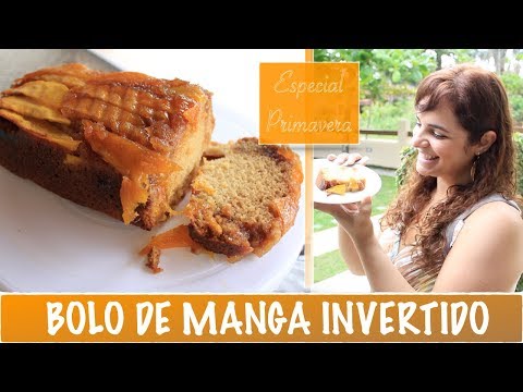 Essa receita é bem simples, fica um bolo bem fofinho e molhadinho, com pedaços de manga caramelada por cima e por baixo.