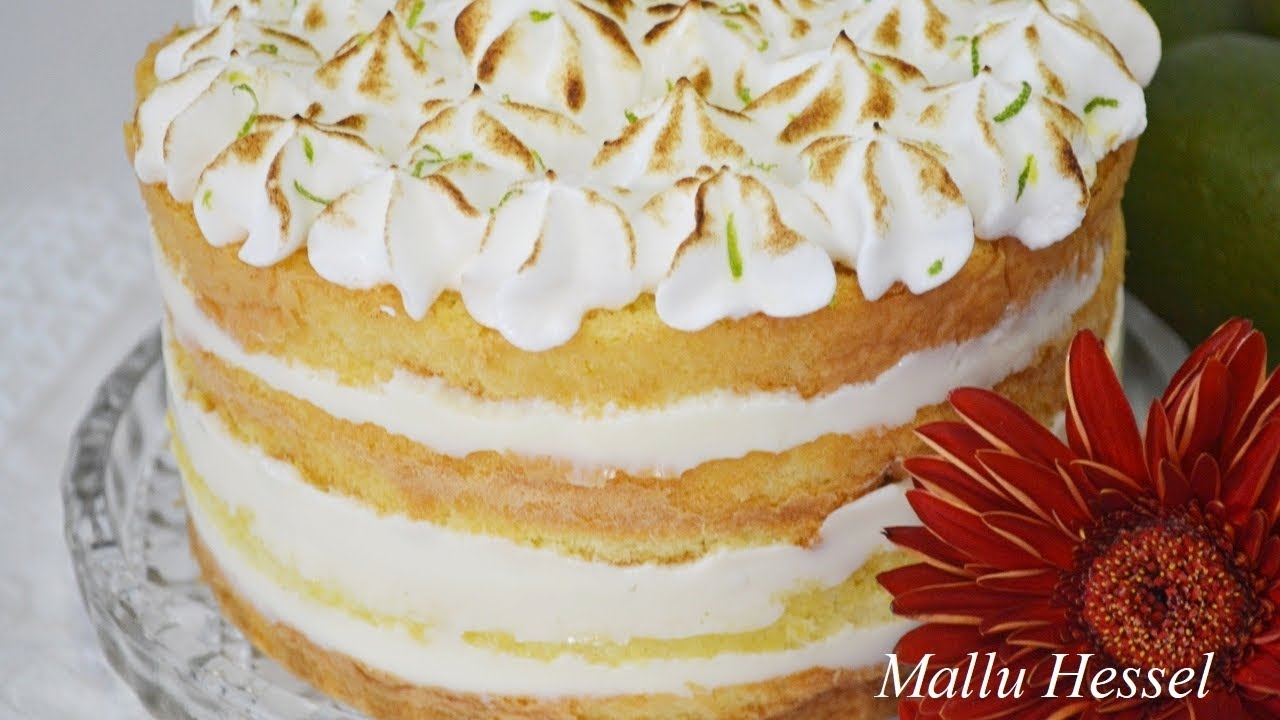 Essa receita também é de um bolo rechado, mas é ao estilo nacked (sem cobertura nas laterais), com massa branca de pão de ló e com merengue na cobertura.