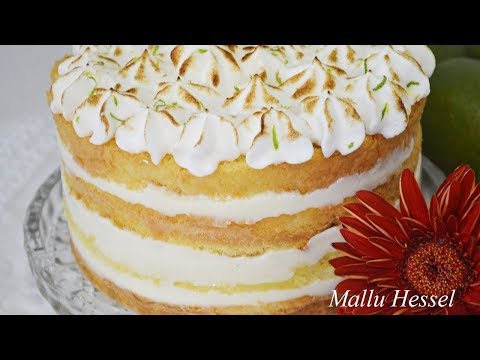Essa receita também é de um bolo rechado, mas é ao estilo nacked (sem cobertura nas laterais), com massa branca de pão de ló e com merengue na cobertura.